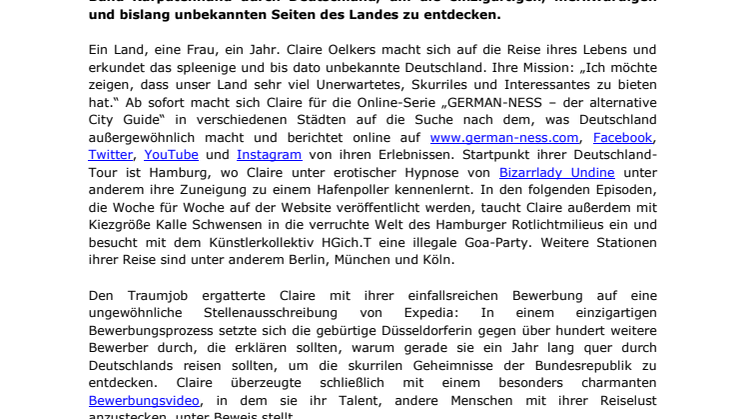 Ermöglicht wird Claires Reise durch die „Expedia Pioneer“ Kampagne, für die abenteuerlustige Entdecker in zahlreichen europäischen Ländern (neben Deutschland auch in Spanien, Italien, den Niederlanden, Frankreich und Großbritannien) auf die Suche nach den unbekannten und ungewöhnlichen Seiten ihres Heimatlandes gehen. „Gerade unter den Jüngeren wird Deutschland als Reiseziel immer beliebter. Mit ‚GERMAN-NESS‘ zeigen wir, wie viele unbekannte Facetten Deutschland zu bieten hat, die häufig rein gar nichts mit den vor allem im Ausland als typisch deutsch bekannten Dingen am Hut haben“, erklärt Andreas Nau, Geschäftsführer bei Expedia.