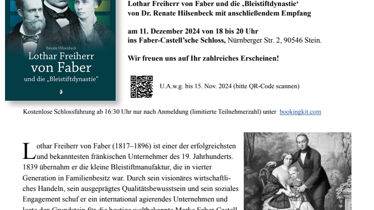 Stein, 22. November 2024. Während das unternehmerische Wirken Lothar von Fabers bereits in mehreren Publikationen gewürdigt worden ist, eröffnet die Auswertung bisher unbekannter privater Korrespondenz neue und mitunter unerwartete Einblicke in das Leben des Firmenchefs und seiner weit verzweigten Familie. Aus diesen einzigartigen Dokumenten ist eine spannende Chronik entstanden, die den „Bleistiftbaron“ mit seinen Angehörigen in einem neuen und sehr privaten Licht erscheinen lässt. Hilsenbecks Studie beleuchtet nicht nur die Entstehung eines erfolgreichen globalen Wirtschaftsunternehmens, sondern beschreibt auch den sozialen Aufstieg und den damit verbundenen veränderten Lebensstil einer Industriellenfamilie im 19. Jahrhundert. Die Briefe lassen uns unmittelbar teilhaben an Freuden und Leiden einer Dynastie, deren Schicksal sich vor dem Panorama einer bewegten weltgeschichtlichen Epoche entfaltet.