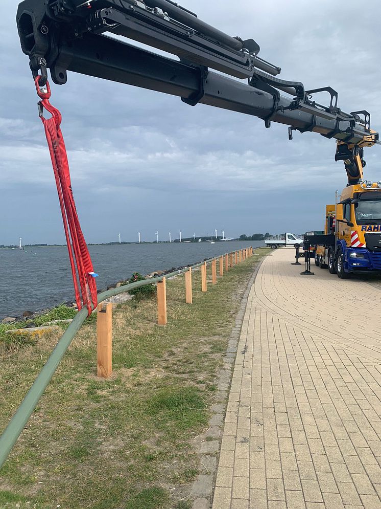 Aufbau des Brückenseils der Fehmarnsundbrücke an der Westmole in Burgtiefe