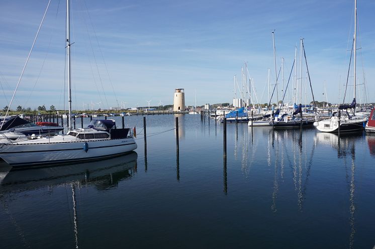 Der Aussichtsturm "Utkieker" auf Fehmarn an der Yachthafenpromenade in Burgtiefe.