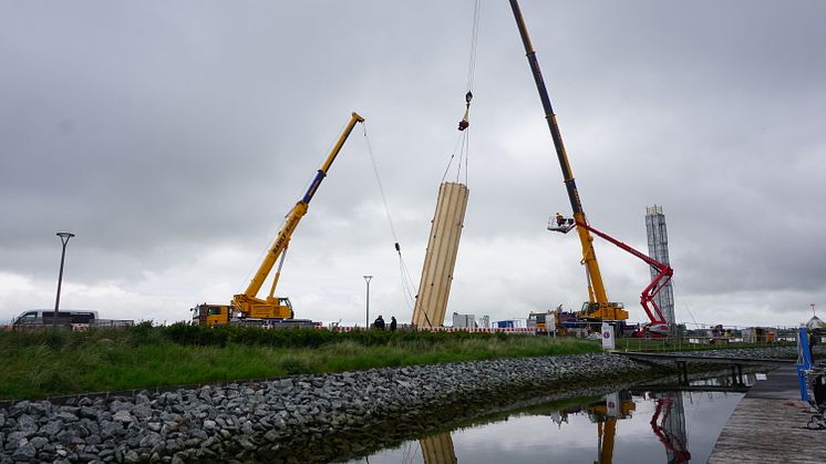 Fehmarn, 27. Mai 2021 – Das neue Bauprojekt des Tourismus-Service Fehmarn schreitet voran: Mit dem Innengerüst, das der neue Aussichtsturm an der Yachthafenpromenade mit Hilfe einer spektakulären Kranung erhalten hat, ist der erste große Schritt bei den Bauarbeiten des zukünftigen Publikumsmagneten getan. Über mehrere Stunden haben zwei Schwerlastkräne die aus Holz gefertigte Röhre über den bereit