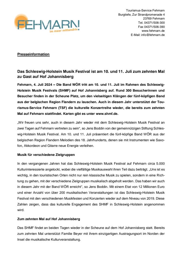In den vergangenen Jahren hat das Schleswig-Holstein Musik Festival auf Fehmarn circa 5.000 Kulturinteressierte angelockt, wobei die vielfältige Musikauswahl ihren Teil dazu beiträgt. „Uns ist es wichtig, in den touristischen Orten nicht nur rein klassische Musik zu spielen, sondern in eine Richtung zu gehen, mit der verschiedene Zielgruppen musikalisch abgeholt werden. Das haben wir auch in diesem Jahr mit der Band WÖR erreicht“, so Jens Boddin. Mit einem Etat von 12 Millionen Euro und einer Anzahl von über 200 musikalischen Veranstaltungen ist das Schleswig-Holstein Musik Festival mit den verschiedenen Musikfesten und Konzerten wieder auf dem Niveau von 2019. Diese Zahlen zeigen, dass das kulturelle Engagement des SHMF in Schleswig-Holstein angenommen wird.