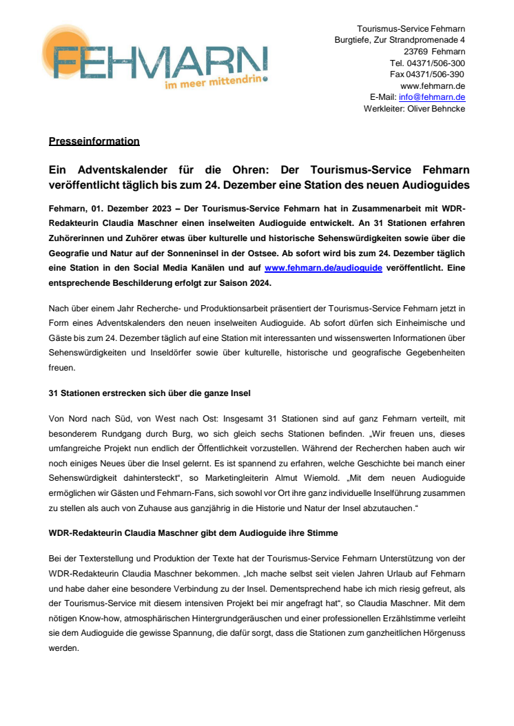 Nach über einem Jahr Recherche- und Produktionsarbeit präsentiert der Tourismus-Service Fehmarn jetzt in Form eines Adventskalenders den neuen inselweiten Audioguide. Ab sofort dürfen sich Einheimische und Gäste bis zum 24. Dezember täglich auf eine Station mit interessanten und wissenswerten Informationen über Sehenswürdigkeiten und Inseldörfer sowie über kulturelle, historische und geografische Gegebenheiten freuen.