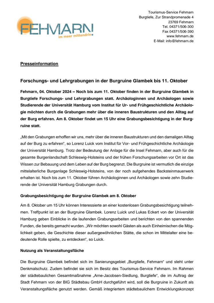 Am 8. Oktober um 15 Uhr können Interessierte an einer kostenlosen Grabungsbesichtigung teilnehmen. Treffpunkt ist an der Burgruine Glambek. Lorenz Luick und Lukas Eckert von der Universität Hamburg geben Einblicke in die laufenden Grabungsarbeiten und berichten von den spannenden Funden, die bereits gemacht wurden. „Wir möchten sowohl Gästen als auch Einheimischen die Möglichkeit geben, die Geschichte dieser außergewöhnlichen Stätte, die schon im Mittelalter eine bedeutende Rolle spielte, zu entdecken“, so Luick.