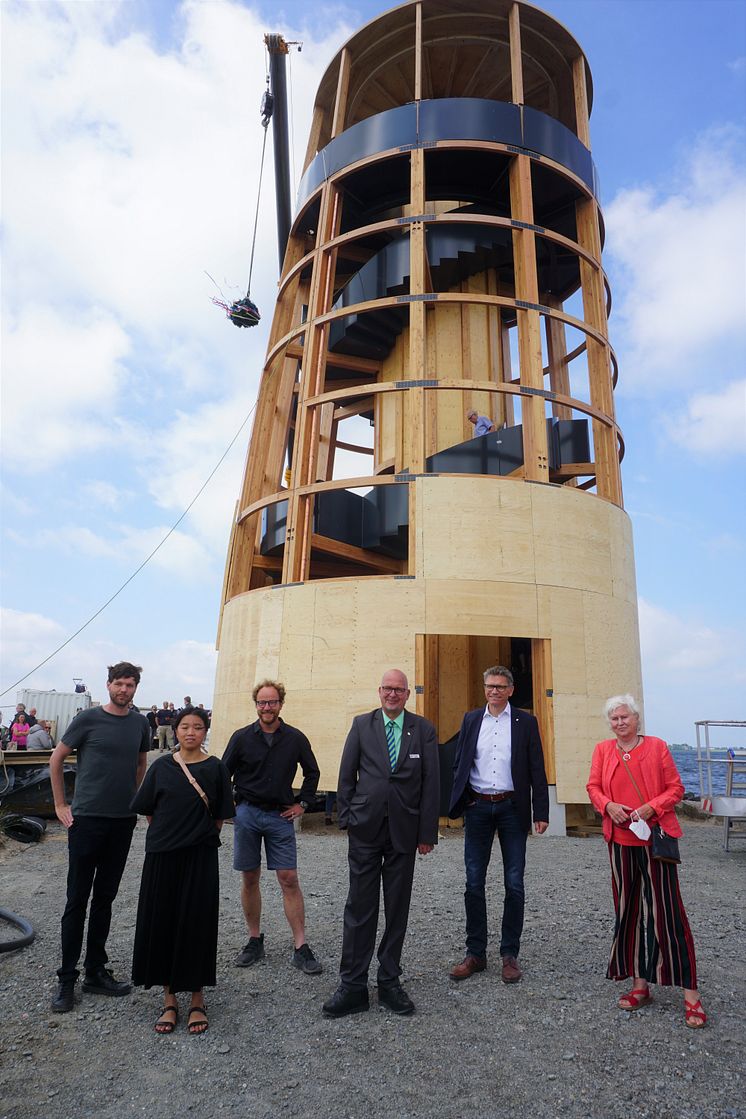 Fehmarn, 02. Juli 2021 – Der Tourismus-Service Fehmarn feierte heute das Richtfest des neuen Aussichtsturms, der im Zuge des geförderten Projektes „Um- und Neugestaltung der Binnensee- und Yachthafenpromenade“ im Süden der Ostseeinsel erbaut wird. Mit einem Bauvolumen von rund 1 Million Euro ist der barrierefreie, ca. 18 Meter hohe Turm ein wesentliches Erlebniselement der 2019 fertiggestellten Flaniermeile in Burgtiefe. In wenigen Wochen sollen die ersten Besucherinnen und Besucher den Turm bereits betreten können.