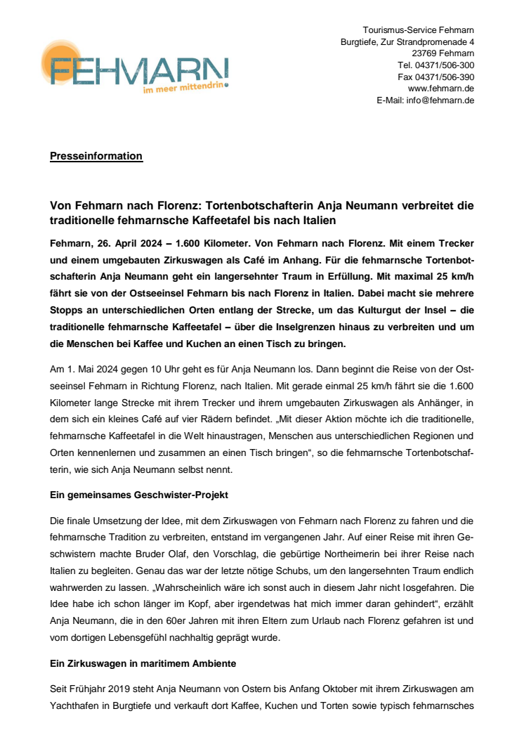 Am 1. Mai 2024 gegen 10 Uhr geht es für Anja Neumann los. Dann beginnt die Reise von der Ostseeinsel Fehmarn in Richtung Florenz, nach Italien. Mit gerade einmal 25 km/h fährt sie die 1.600 Kilometer lange Strecke mit ihrem Trecker und ihrem umgebauten Zirkuswagen als Anhänger, in dem sich ein kleines Café auf vier Rädern befindet. „Mit dieser Aktion möchte ich die traditionelle, fehmarnsche Kaffeetafel in die Welt hinaustragen, Menschen aus unterschiedlichen Regionen und Orten kennenlernen und zusammen an einen Tisch bringen“, so die fehmarnsche Tortenbotschafterin, wie sich Anja Neumann selbst nennt.