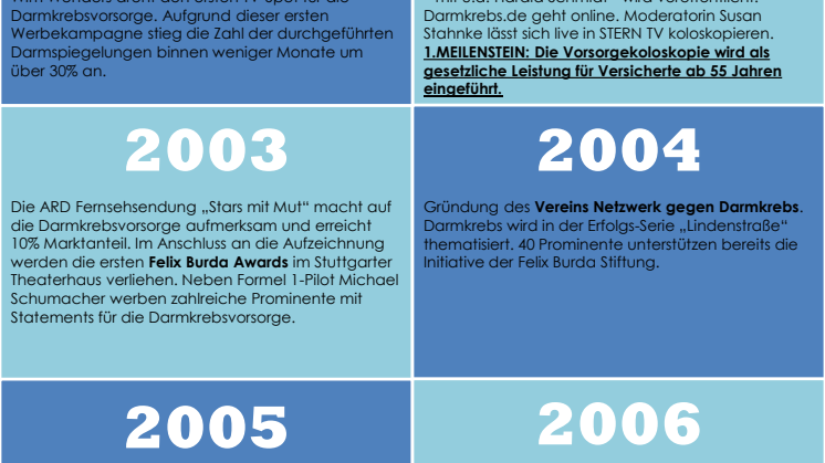 Darmkrebs musste erst einmal raus aus der Tabuzone. Offiziell gegründet wurde die Stiftung am 5. November 2001. Schon Anfang 2002 riefen wir gemeinsam mit Partnern den ersten nationalen Darmkrebsmonat März aus – einen Monat Öffentlichkeitsarbeit ganz im Zeichen der Darmkrebsvorsorge. Und das mit großem Erfolg: Unter dem medialen Druck wurde im Oktober 2002 die Vorsorgedarmspiegelung als gesetzliche Leistung der Krankenkassen für Versicherte ab dem Alter von 55 Jahren eingeführt – der erste und bedeutendste Meilenstein. Damit war die bislang kostenpflichtige Untersuchung kostenfrei geworden.