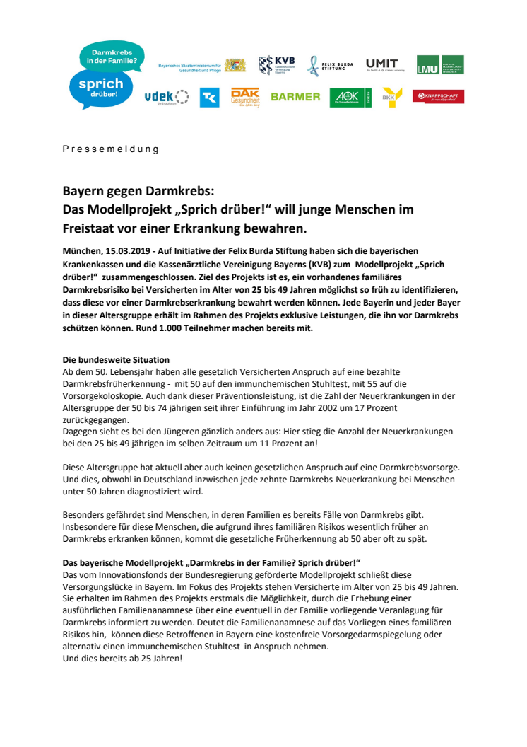 Auf Initiative der Felix Burda Stiftung haben sich die bayerischen Krankenkassen und die Kassenärztliche Vereinigung Bayerns (KVB) zum Modellprojekt „Sprich drüber!“ zusammengeschlossen. Ziel des Projekts ist es, Versicherte mit familiärem Risiko im Alter von 25 bis 49 Jahren früh zu identifizieren und sie vor einer Darmkrebserkrankung zu bewahren. Exklusive Leistungen für Bayern.
