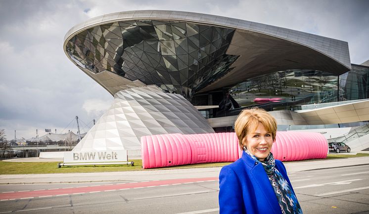 Mit dem größten Darmmodell Europas wirbt Dr. Christa Maar, Vorstand der Felix Burda Stiftung, vor der BMW Welt für den Felix Burda Award am 17.4.2016.