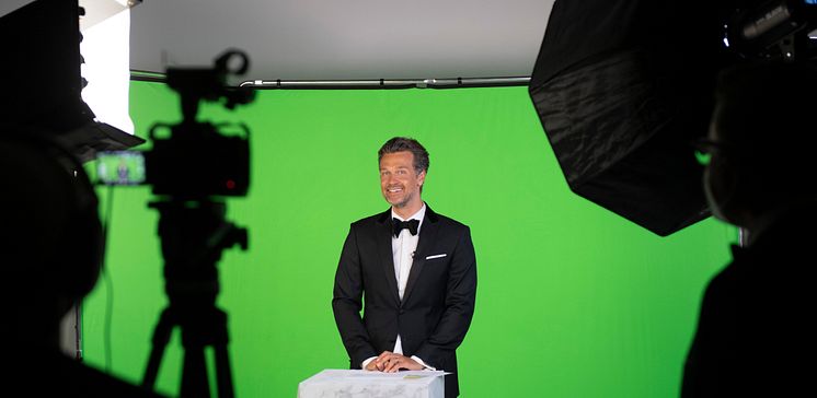 Schauspieler Wayne Carpendale hält die Laudatio auf die Ehrenfelix-Preisträgerin 2021, Susanna Zsoter.