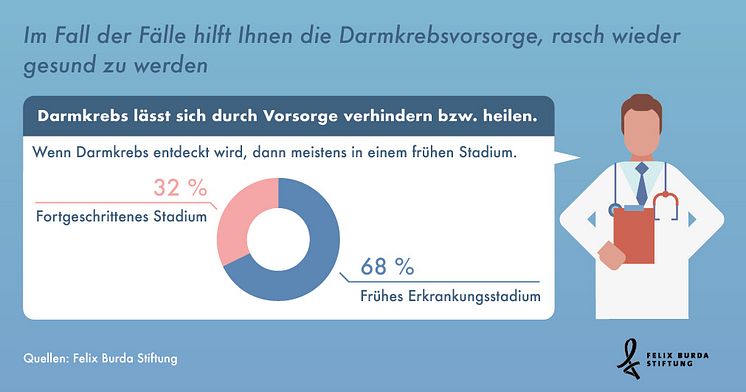 In 1% der Vorsorge-Darmspiegelungen wird Darmkrebs entdeckt. Aber selbst in diesen Fällen befindet sich der Krebs zu 68% in einem frühen Stadium und kann noch gut behandelt und geheilt werden.