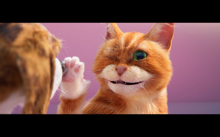 Szene mit zwinkernder Katze und Beagle aus der Kampagne der Felix Burda Stiftung zum Darmkrebsmonat März.