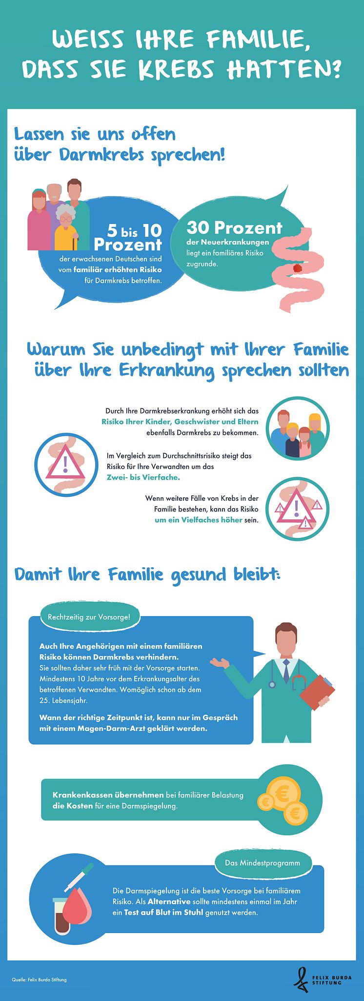 Diese Grafik zeigt, warum Krebspatienten ihre Verwandtschaft informieren sollten und was Angehörige gegen eine Darmkrebserkrankung tun können.