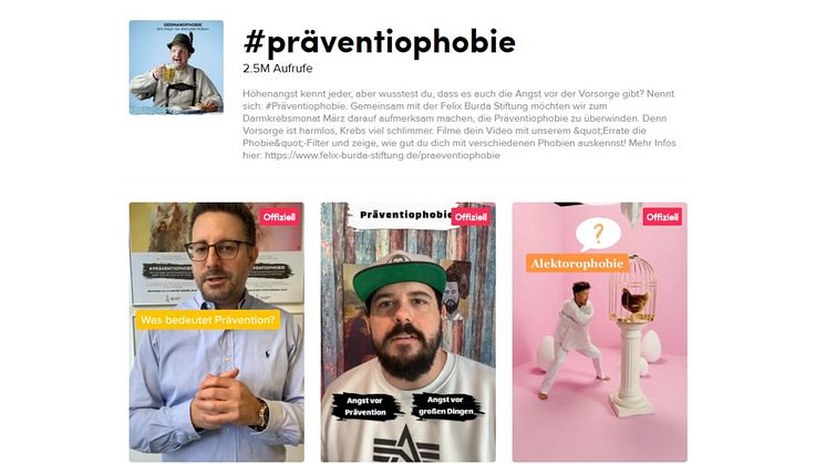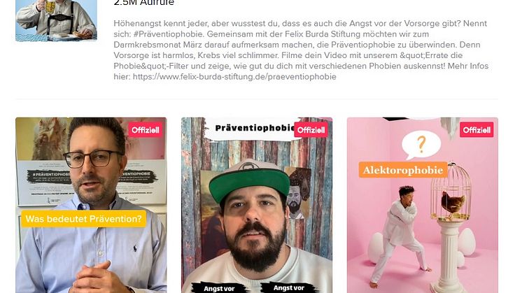 Um im Darmkrebsmonat März 2020 das Thema #Präventiophobie auch auf TikTok zu kommunizieren, wurde das von der Agentur Serviceplan Health & Life entwickelte Kampagnen-Konzept auf TikTok übertragen: Mittels des „Errate die Phobie“ – Filters können sich die User der App auf ein Phobien-Quiz einlassen und per Finger-Tipp zum Fachbegriff die richtige Lösung auswählen. Die Clips werden anschließend mit dem Hashtag #Präventiophobie auf TikTok gepostet.