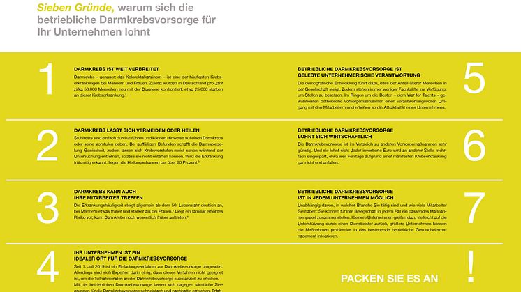 Die betriebliche Darmkrebsvorsorge als kostenfreie Gesundheitsleistung für Mitarbeiter, hat sich als ein fester Bestandteil des Gesundheitsmanagements vieler Unternehmen etabliert. Die nun komplett überarbeitete 4. Auflage des Handlungsleitfadens berücksichtigt aktuelle Daten, neue Erkenntnisse, sowie gesetzgeberische Veränderungen und zeigt weitere Best-Practice-Beispiele von BKK PwC, Salamander und Deutschem Krebsforschungszentrum (DKFZ).