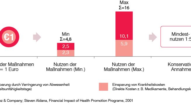 Krankheitsbedingt fallen in deutschen Unternehmen jährliche Kosten von rund 129 Mrd. Euro an, so die Studie „Vorteil Vorsorge – die Rolle der betrieblichen Gesundheitsvorsorge für die Zukunftsfähigkeit des Wirtschaftsstandortes Deutschland“ (Booz & Company, 2011). Die betriebliche Darmkrebsvorsorge bietet in diesem Zusammenhang einen attraktiven ROI von bis zu 1:5. Für jeden in die betriebliche Darmkrebsvorsorge investierten Euro, ergeben sich für die Unternehmen in Deutschland Einsparungen von 2-5 Euro.