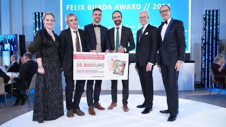 Die Preisträger in der Kategorie "Medizin & Wissenschaft" mit Leonie Bücher (Geschäftsführerin MyLife Media) und Moderator Vince Ebert