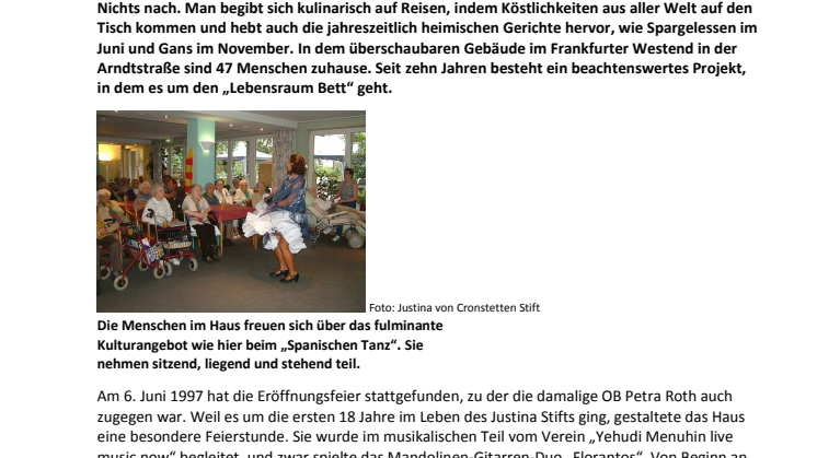 Am 6. Juni 1997 hat die Eröffnungsfeier stattgefunden, zu der die damalige OB Petra Roth auch zugegen war. Weil es um die ersten 18 Jahre im Leben des Justina Stifts ging, gestaltete das Haus eine besondere Feierstunde. Sie wurde im musikalischen Teil vom Verein „Yehudi Menuhin live music now“ begleitet, und zwar spielte das Mandolinen-Gitarren-Duo „Florantos“. Von Beginn an führt der Verein jedes Jahr vier Konzerte im Hause auf. Auch weitere Musiker und Sänger kommen hierher – und nicht nur einmalig – so etwa das „Ensemble Incendo Berlin“, die Country-Legende „Drifters Caravan, die „Gospel Combination“ oder der „Ural Kosaken Chor“. Da das Gebäude in der Nähe des bekannten Frankfurter Palmengartens liegt, können ihn die Hausbewohner mit ehrenamtlicher Unterstützung seit 1998 regelmäßig besuchen. Aber auch andere Ziele stehen wöchentlich auf dem Programm. Stolz weist Graber-Dünow darauf hin, dass seit 1999 jährlich eine Länderwoche veranstaltet wird. Es werden die Kultur und das Essen naher und ferner Länder den Bewohnern und auch Angehörigen präsentiert. „In unserer Indischen Woche war z. B. ein Thullal-Tanztheater zu sehen. Und nach einem Schlangentanz der Bauchtänzerin Sho`ira gab es eine lebende Boazum Anfassen.“