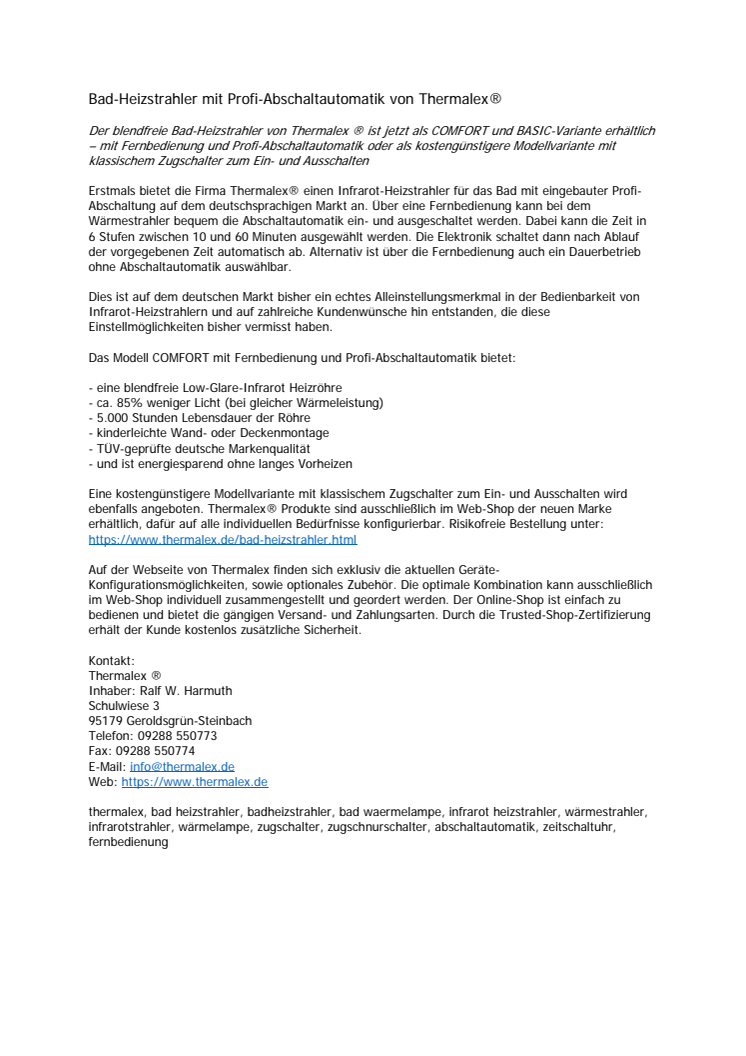 Der blendfreie Bad-Heizstrahler von Thermalex ® ist jetzt als COMFORT und BASIC-Variante erhältlich – mit Fernbedienung und Profi-Abschaltautomatik oder als kostengünstigere Modellvariante mit klassischem Zugschalter zum Ein- und Ausschalten