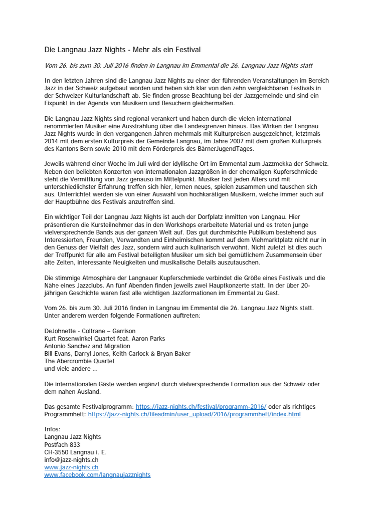 Vom 26. bis zum 30. Juli 2016 finden in Langnau im Emmental die 26. Langnau Jazz Nights statt