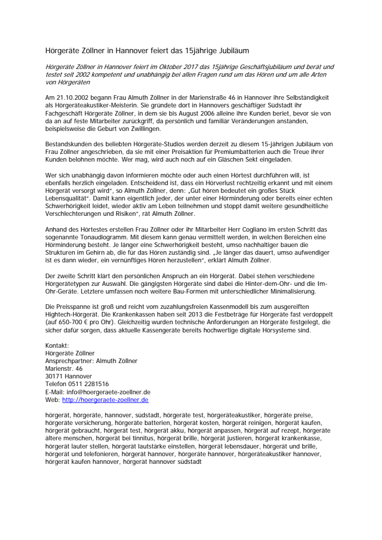 Hörgeräte Zöllner in Hannover feiert im Oktober 2017 das 15jährige Geschäftsjubiläum und berät und testet seit 2002 kompetent und unabhängig bei allen Fragen rund um das Hören und um alle Arten von Hörgeräten