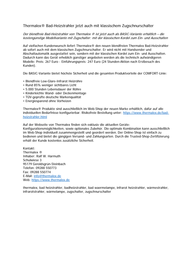 Der blendfreie Bad-Heizstrahler von Thermalex ® ist jetzt auch als BASIC-Variante erhältlich – die kostengünstige Modellvariante mit Zugschalter: mit der klassischen Kordel zum Ein- und Ausschalten
