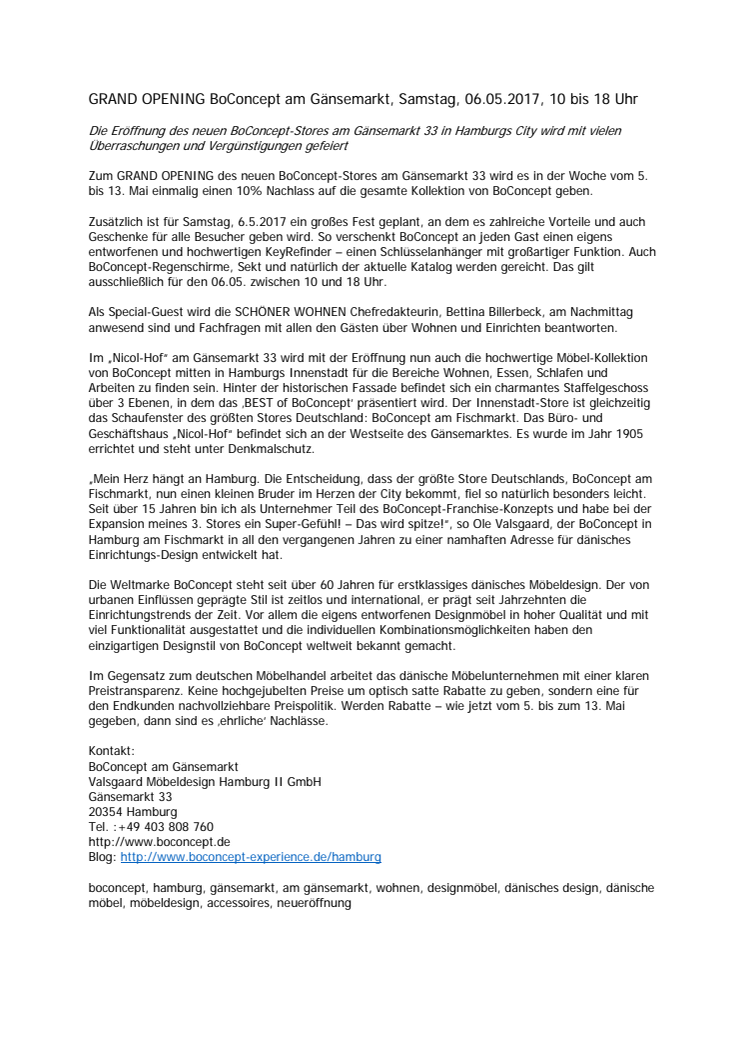 GRAND OPENING BoConcept am Gänsemarkt, Samstag, 06.05.2017, 10 bis 18 Uhr