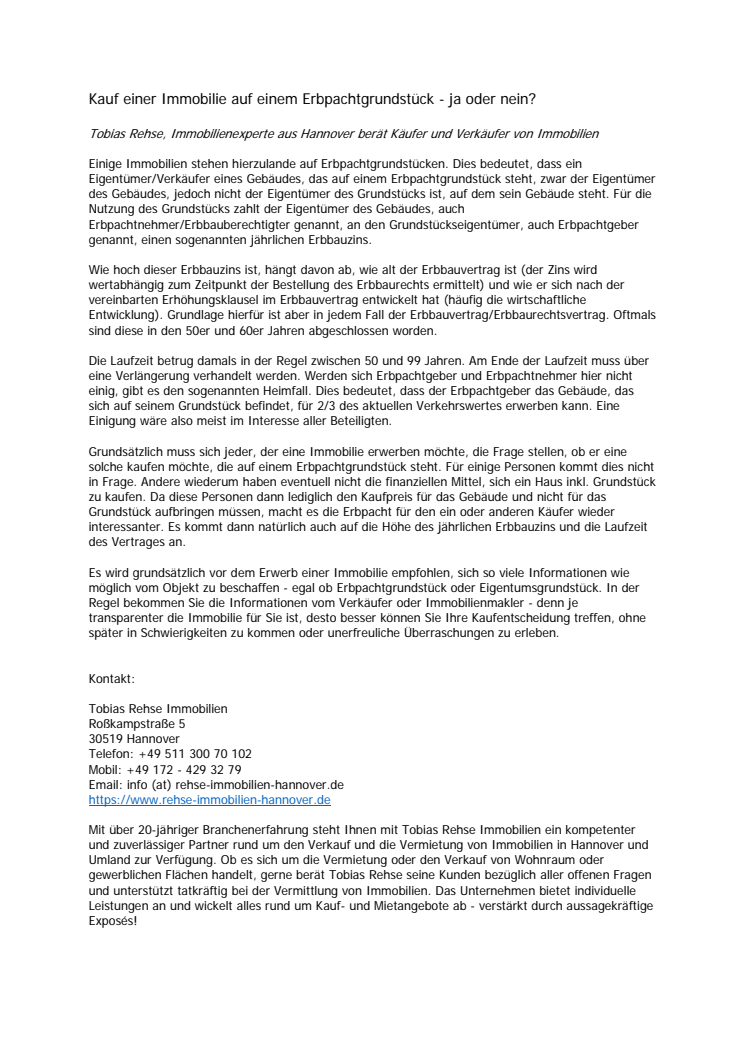 Mit über 20-jähriger Branchenerfahrung steht Ihnen mit Tobias Rehse Immobilien ein kompetenter und zuverlässiger Partner rund um den Verkauf und die Vermietung von Immobilien in Hannover und Umland zur Verfügung. Ob es sich um die Vermietung oder den Verkauf von Wohnraum oder gewerblichen Flächen handelt, gerne berät Tobias Rehse seine Kunden bezüglich aller offenen Fragen und unterstützt tatkräftig bei der Vermittlung von Immobilien. Das Unternehmen bietet individuelle Leistungen an und wickelt alles rund um Kauf- und Mietangebote ab - verstärkt durch aussagekräftige Exposés!