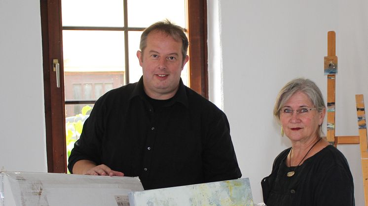 Foto: Lars Schumacher und Renate Golde mit den ersten Werken aus Chicago im KuNo Kunsthaus Nordstemmen.