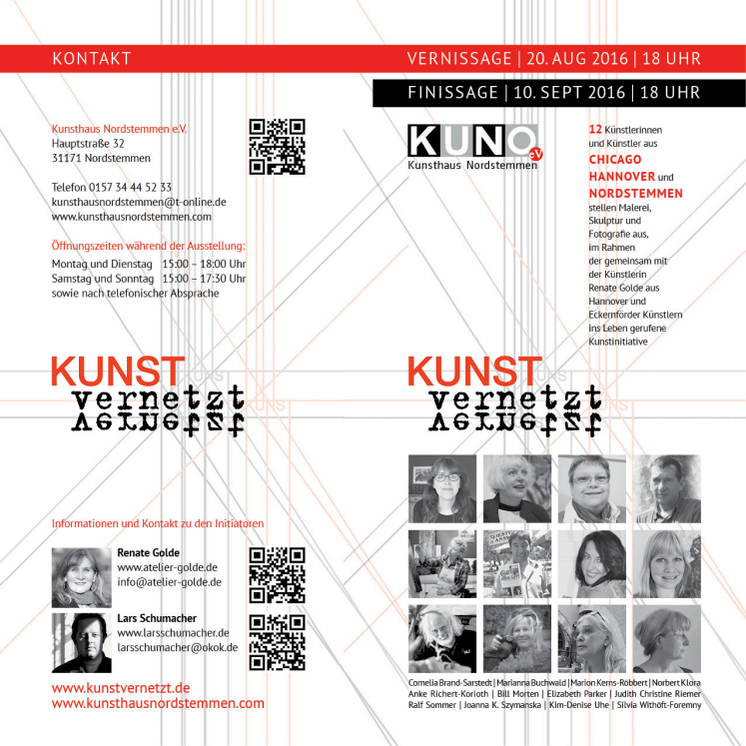 12 Künstler aus Chicago, Hannover und Nordstemmen stellen im Rahmen der Inititive "KUNSTVERNETZT" von Künstlerinnen und Künstlern zum gegenseitigen Austausch und der Kooperation aus. Mit Cornelia Brand-Sarstedt, Marianna Buchwald, Marion Kerns-Röbbert, Norbert Klora, Anke Korioth, Bill Morton, Elizabeth Parker, Judith Riemer, Ralf Sommer, Joanna K Szymanska, Kim-Denise Uhe und Silvia Withöft-Foremny sind es in dieser Ausstellung interessante Künstler mit dem Focus auf Malerei (Öl, Aquarell und Acryl) Skulptur, Fotografie und sozialem Engagement, denn einige der Künstler veranstalten zum Teil selbst internationale Kunstveranstaltungen. Mit dieser dritten Ausstellung, deren Vorläufer in Hannover und Eckernförde stattgefunden haben, präsentieren sich erstmals internationale Künstler aus Chicago mit Künstlern aus Nordstemmen und Hannover.