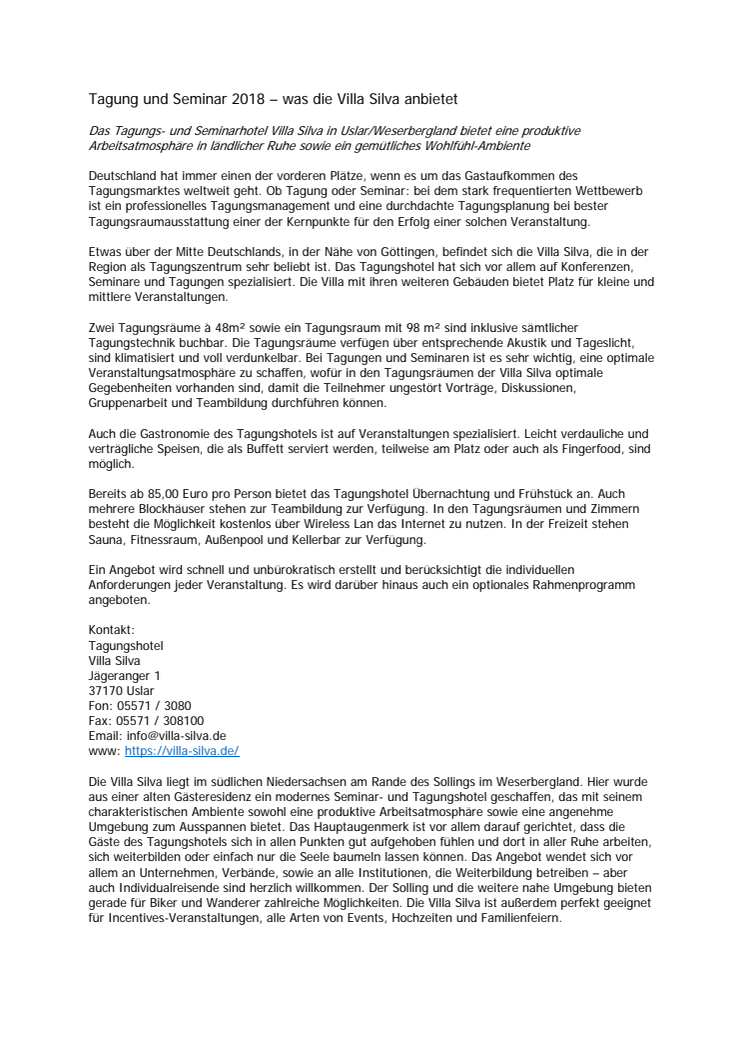 Die Villa Silva liegt im südlichen Niedersachsen am Rande des Sollings im Weserbergland. Hier wurde aus einer alten Gästeresidenz ein modernes Seminar- und Tagungshotel geschaffen, das mit seinem charakteristischen Ambiente sowohl eine produktive Arbeitsatmosphäre sowie eine angenehme Umgebung zum Ausspannen bietet. Das Hauptaugenmerk ist vor allem darauf gerichtet, dass die Gäste des Tagungshotels sich in allen Punkten gut aufgehoben fühlen und dort in aller Ruhe arbeiten, sich weiterbilden oder einfach nur die Seele baumeln lassen können. Das Angebot wendet sich vor allem an Unternehmen, Verbände, sowie an alle Institutionen, die Weiterbildung betreiben – aber auch Individualreisende sind herzlich willkommen. Der Solling und die weitere nahe Umgebung bieten gerade für Biker und Wanderer zahlreiche Möglichkeiten. Die Villa Silva ist außerdem perfekt geeignet für Incentives-Veranstaltungen, alle Arten von Events, Hochzeiten und Familienfeiern.