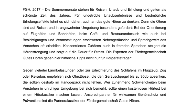 FGH, 2017 – Die Sommermonate stehen für Reisen, Urlaub und Erholung und gelten als schönste Zeit des Jahres. Für ungetrübte Urlaubserlebnisse und bestmögliche Erholungseffekte lohnt es sich daher, auch an das gute Hören zu denken. Denn die Ohren sind auf Reisen und in ungewohnter Umgebung besonders gefordert: Bei der Orientierung auf Flughäfen und Bahnhöfen, beim Café- und Restaurantbesuch wie auch bei Besichtigungen und Veranstaltungen erschweren Nebengeräusche und Sprachgewirr das Verstehen oft erheblich. Konzentriertes Zuhören auch in fremden Sprachen steigert die Höranstrengung und sorgt auf die Dauer für Stress. Die Experten der Fördergemeinschaft Gutes Hören geben hier hilfreiche Tipps nicht nur für Hörgeräteträger: