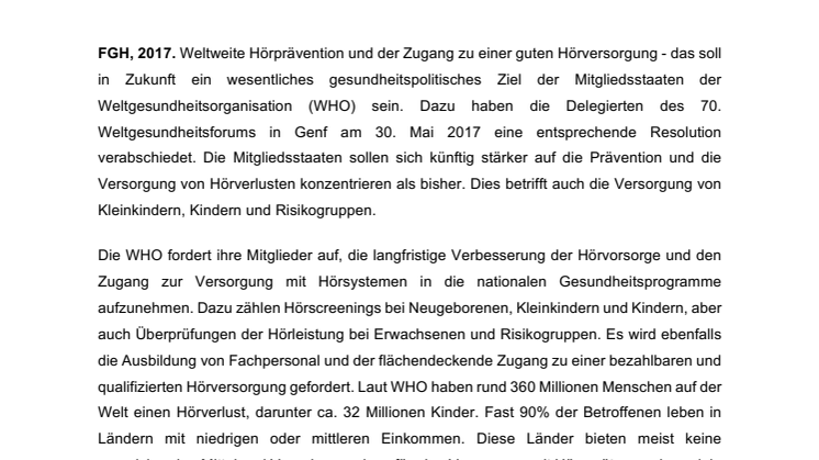 FGH, 2017. Weltweite Hörprävention und der Zugang zu einer guten Hörversorgung - das soll in Zukunft ein wesentliches gesundheitspolitisches Ziel der Mitgliedsstaaten der Weltgesundheitsorganisation (WHO) sein. Dazu haben die Delegierten des 70. Weltgesundheitsforums in Genf am 30. Mai 2017 eine entsprechende Resolution verabschiedet. Die Mitgliedsstaaten sollen sich künftig stärker auf die Prävention und die Versorgung von Hörverlusten konzentrieren als bisher. Dies betrifft auch die Versorgung von Kleinkindern, Kindern und Risikogruppen.