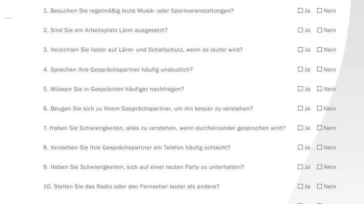 Einige einfache Fragen helfen dabei, das eigene Hörvermögen einzuschätzen. Voraussetzung ist natürlich, dass man sich selbst gegenüber bei der Beantwortung ehrlich bleibt. Dafür hat die Fördergemeinschaft Gutes Hören zehn Fragen zusammengestellt, die schnell beantwortet sind. „Die Testfragen beziehen sich auf alltägliche Situationen, in denen es auf Sprachverstehen und das Hören bestimmter Geräusche ankommt“, erläutert Burkhard Stropahl. „Diese Fragen sind natürlich kein Ersatz für einen Hörtest beim Fachmann, aber die Beantwortung kann wichtige erste Hinweise auf das eigene Hörvermögen geben.“ (zum Download FGH Hörtest-Fragebogen)