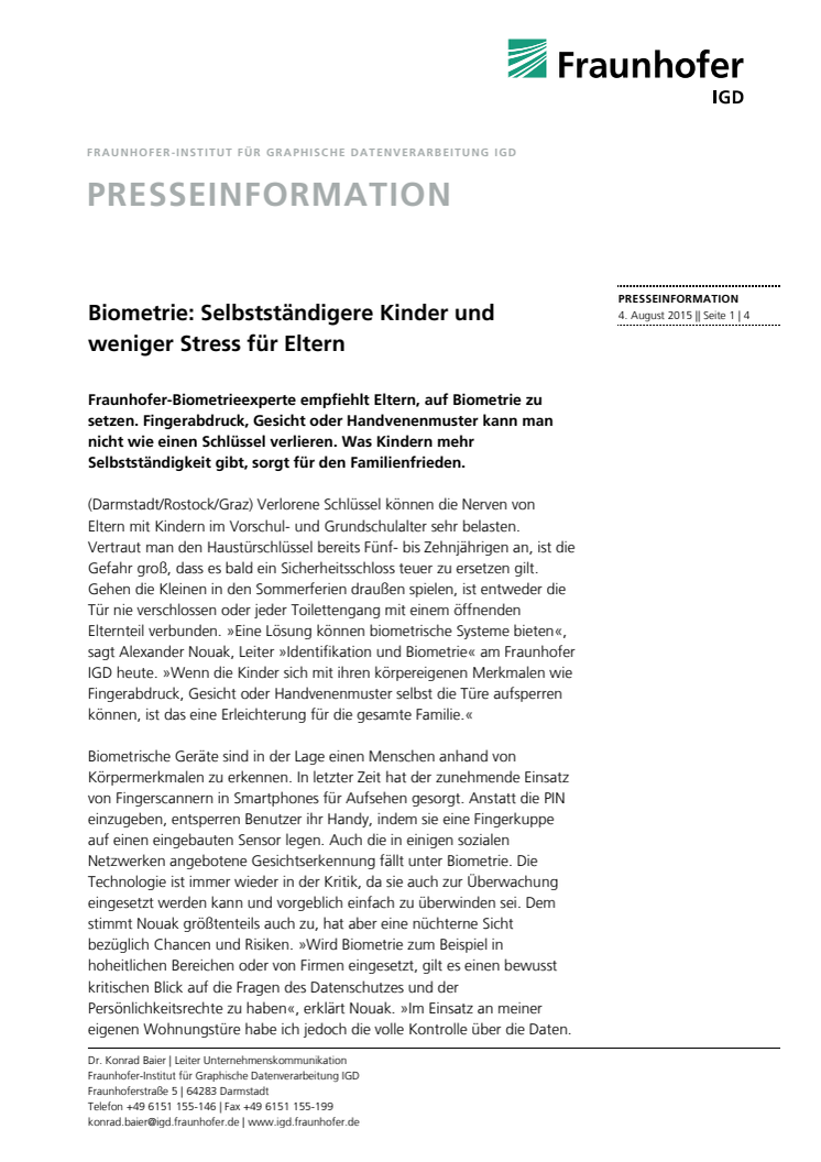 Fraunhofer-Biometrieexperte empfiehlt Eltern, auf Biometrie zu setzen. Fingerabdruck, Gesicht oder Handvenenmuster kann man nicht wie einen Schlüssel verlieren. Was Kindern mehr Selbstständigkeit gibt, sorgt für den Familienfrieden.