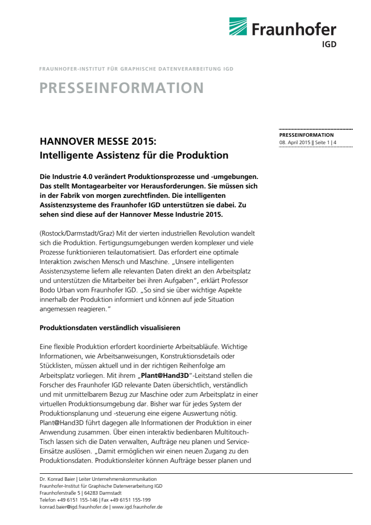 HANNOVER MESSE 2015: Intelligente Assistenz für die Produktion