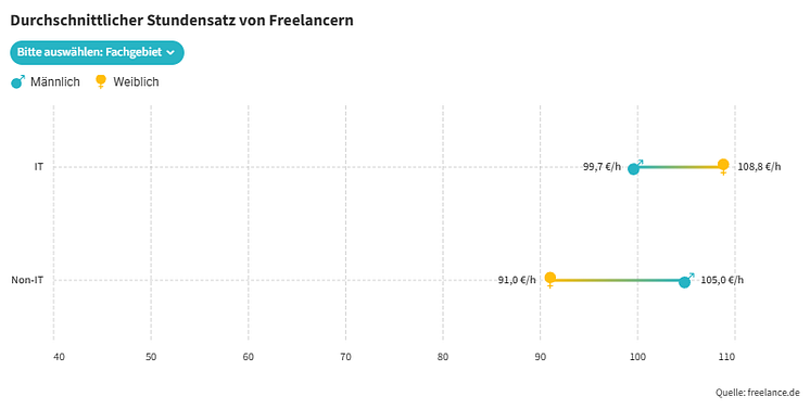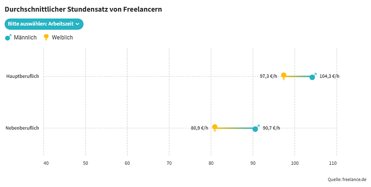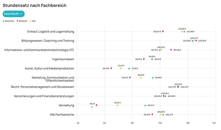 - Der aktuelle durchschnittliche Stundensatz beträgt 100,55 € – Hier auf Unterschiede im Geschlecht und Fachbereich hinweisen