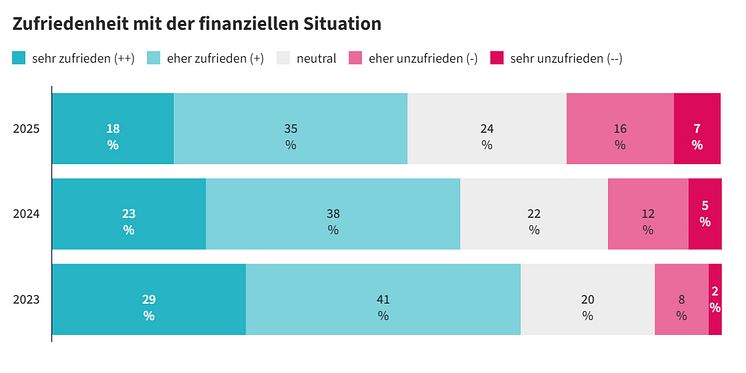 - 53 % sind mit ihrer finanziellen Situation eher oder sehr zufrieden. Im Jahr 2024 waren es noch 61 %.