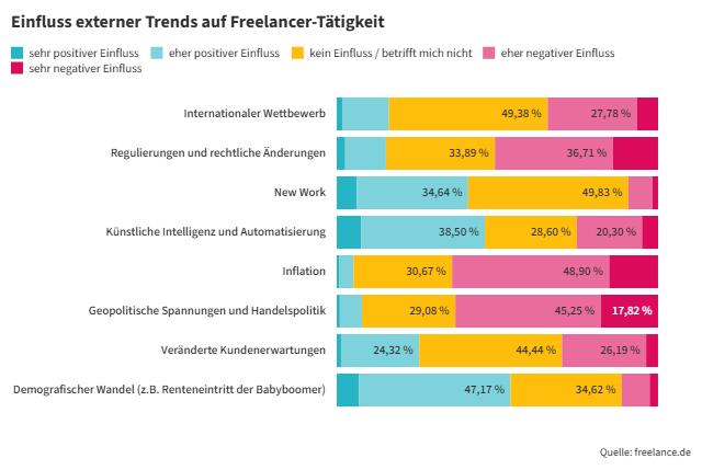 - 66 % der befragten Freelancer fühlen sich von der Politik nicht ausreichend unterstützt. In der Vorjahresstudie 2024 lag dieser Wert bereits bei 61 % – ein erneuter Anstieg des politischen Vertrauensverlusts.