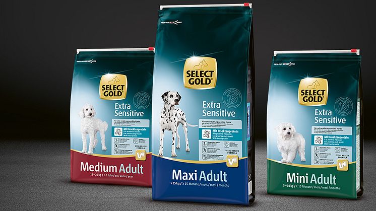 Das neue SELECT GOLD Extra Sensitive gibt es ab sofort in den Fressnapf-Märkten sowie im Onlineshop mit speziellen Rezepturen für insgesamt drei Hundegrößen: Mini, Medium und Maxi sowie in den drei Gebindegrößen 1 kg, 4 kg und 12 kg. Alle Varianten verfügen über die gleichen, für sehr ernährungssensible Hunde passenden, guten Eigenschaften. Die verschiedenen Rezepturen sind dabei stets auf die individuellen Bedürfnisse der jeweiligen Hundegröße zugeschnitten. Im Markt werden KundInnen und deren Hunde gerne beraten und können kostenlose Probierpakete erhalten.