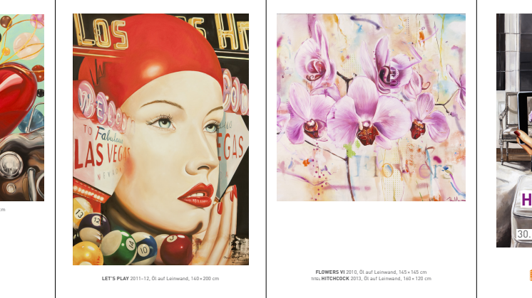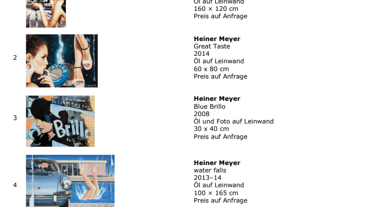 „But is it art?“, stellt die Hollywood-Starlet per Sprechblase in den Raum – „Yes darling“, bekommt sie zur Antwort, von Donald Duck per se; des Weiteren zeigt das Topmodel, was es zu bieten hat, der Porsche parkt nächst dem Swimmingpool und die Beauty nascht lasziv aus der Dose Kaviar. Die kessen wie kühlen Schönheiten in Öl auf Leinwand von Post-Pop-Art-Legende Heiner Meyer aus Bielefeld spielen mit den Sehnsüchten einer Konsum orientierten Gesellschaft, sie geizen dabei weder mit Reizen noch mit Klischees und hinterfragen diese indes ironisch hinterlistig – das Alles verpackt hinter strahlender Fassade von surrealer Anmutung!