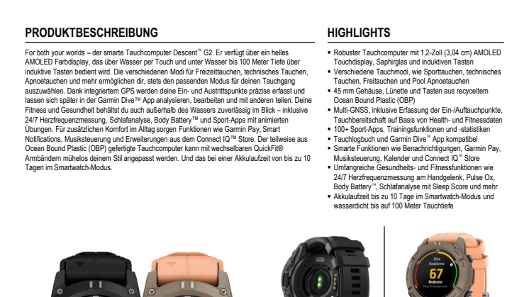 München, 12. Februar 2025 – Garmin kündigt heute den Descent G2 an. Die nächste Generation seines robusten und smarten Tauchcomputers mit Multisport-Funktionen.