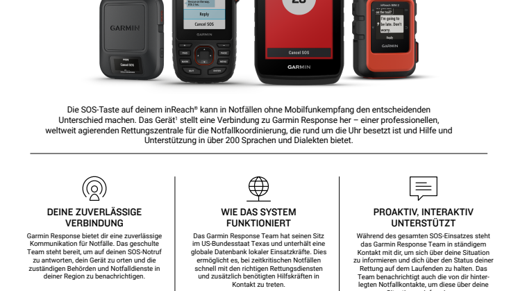 Durch eine spezielle SOS-Taste und einer 100-prozentigen globalen Iridium-Satellitennetzabdeckung können Garmin inReach-Benutzende im Notfall schnell eine SOS-Nachricht senden. Sobald die SOS-Taste gedrückt wird, sendet das Gerät eine Notmeldung an Garmin Response, ein rund um die Uhr besetztes professionelles Koordinationszentrum für die Notfallüberwachung und Rettungskoordinierung. Garmin Response kommuniziert mit dem Benutzenden, den aufgelisteten Notfallkontakten, Such- und Rettungsorganisationen und anderen verfügbaren lokalen Ressourcen. Sie informieren den Benutzenden und die Notfallkontakte über den aktuellen Stand der Rettungsmaßnahmen, einschließlich der Bestätigung, dass Hilfe unterwegs ist, und bleiben auch während der Abwicklung des Vorfalls jederzeit erreichbar.