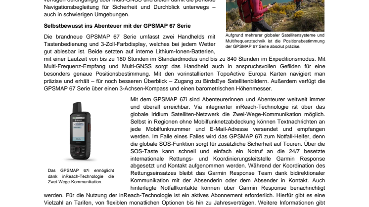 Mit dem GPSMAP 67i sind Abenteurerinnen und Abenteurer weltweit immer und überall erreichbar. Via integrierter inReach-Technologie ist über das globale Iridium Satelliten-Netzwerk die Zwei-Wege-Kommunikation möglich. Selbst in Regionen ohne Mobilfunknetzabdeckung können Textnachrichten an jede Mobilfunknummer und E-Mail-Adresse versendet und empfangen werden. Im Falle eines Falles wird das GPSMAP 67i zum Notfall-Helfer, denn die globale SOS-Funktion sorgt für zusätzliche Sicherheit auf Touren. Über die SOS-Taste kann schnell und einfach ein Notruf an die 24/7 besetzte internationale Rettungs- und Koordinierungsleitstelle Garmin Response abgesetzt und Kontakt aufgenommen werden. Während der Koordination des Rettungseinsatzes bleibt das Garmin Response Team dank bidirektionaler Kommunikation mit der Absenderin oder dem Absender in Kontakt. Auch hinterlegte Notfallkontakte können über Garmin Response benachrichtigt werden. Für die Nutzung der inReach-Technologie ist ein aktives Abonnement erforderlich. Hierfür gibt es eine Vielzahl an Tarifen, von flexiblen monatlichen Optionen bis hin zu Jahresverträgen. Weitere Informationen gibt es hier.