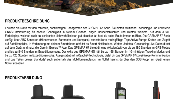 München, 14. März 2023 – Das GPSMAP 67/67i und das eTrex SE sind die neuesten Generationen an Outdoor-Handhelds, die mit hilfreichen Tools für die Wegfindung und einer längeren Akkulaufzeit auch für ausdauernde Expeditionen ausgestattet sind. Die Modelle verfügen durchgängig über Multi-GNSS und bieten damit die perfekte Navigationsbegleitung für Sicherheit und Durchblick unterwegs – auch in schwierigen Umgebungen.