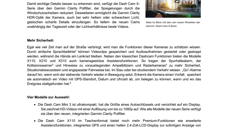 Weitere Informationen zu den Produkten finden sich unter folgenden Links Garmin Dash Cam™ Mini 3, Garmin Dash Cam™ X110, Garmin Dash Cam™ X210, Garmin Dash Cam™ X310, Cat.Page: DASH CAMS & RÜCKFAHRKAMERAS