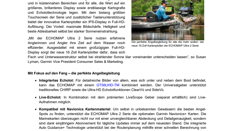„Mit der ECHOMAP Ultra 2 Serie nutzen erfahrene Anglerinnen und Angler ihre Zeit auf dem Wasser noch effizienter. Ausgestattet mit einem großzügigen Full-HD-Display sorgt der neue 16 Zoll Kartenplotter dafür, dass sich Fisch und Unterwasserstruktur selbst bei strahlender Sonne klar voneinander unterscheiden lassen”, so Susan Lyman, Garmin Vice President Consumer Sales & Marketing.
