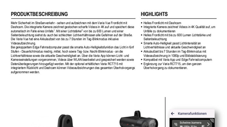 Bei Kopplung mit einem Edge Fahrradcomputer, passt die smarte Auto-Helligkeitsfunktion das Licht in fünf Stufen - Dauerlichtmodus niedrig, mittel, hoch sowie Tag- bzw. Nacht-Blinkmodus - an die Lichtverhältnisse sowie die aktuelle Geschwindigkeit an. Über die Varia App können Licht- und Kameraeinstellungen vorgenommen, Videos über WLAN bearbeitet und gespeichert sowie Datenüberlagerungen hinzugefügt werden. Mit der optional erhältlichen Varia RCT715 mit integriertem Rücklicht und Dashcam können Videoaufzeichnungen eines gesamten Überholvorgangs aufgenommen werden.