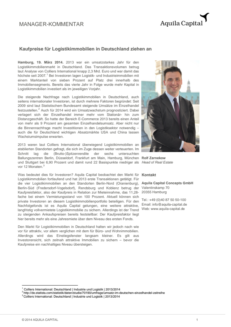 Manager-Kommentar von Aquila Capital: Kaufpreise für Logistikimmobilien in Deutschland ziehen an