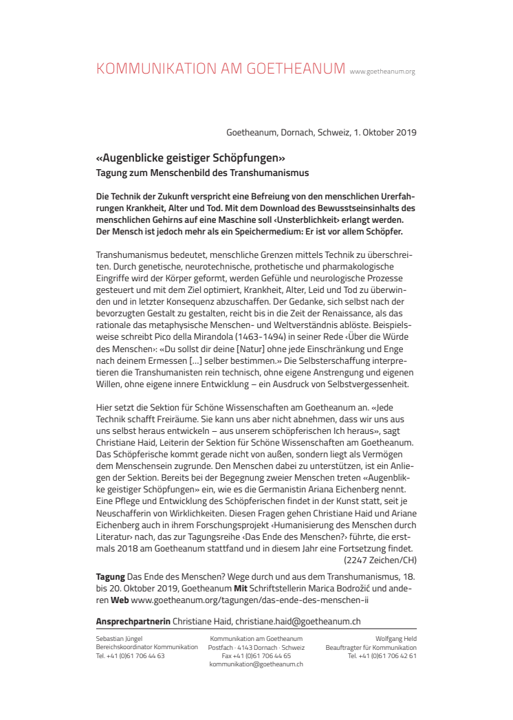 «Augenblicke geistiger Schöpfungen». Tagung zum Menschenbild des Transhumanismus
